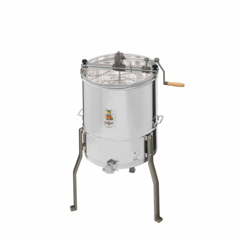 L'extracteur de miel Logar 4 cadres à entraînement manuel allie conception robuste et fonctionnalité réfléchie pour l'apiculteur exigeant. L'entraînement manuel est logé dans un boîtier métallique stable avec roue libre et frein anti-retour pour une utilisation sûre et contrôlée. L'extracteur est de type tangentiel et permet une extraction efficace du miel sans endommager les cadres.