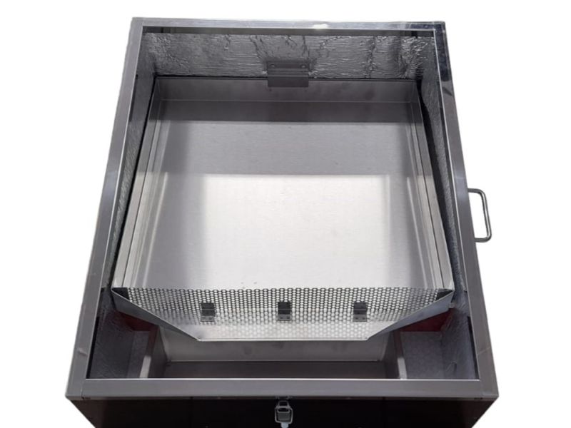 La plaque intérieure amovible mesure 50 x 50 x 6 cm. La cire fondue s'écoule à travers la plaque perforée dans un réservoir à cire de 37 x 11,5 x 6 cm.
