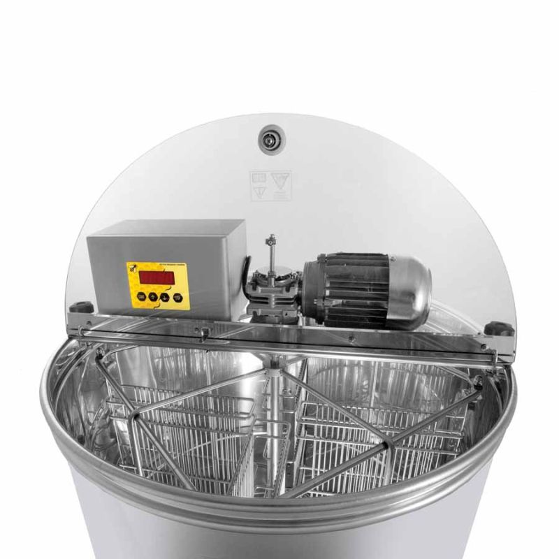 Extracteur auto-basculeur 4 cadres avec moteur 110 W / 230 V, commande entièrement automatique et interrupteur de sécurité qui coupe automatiquement le moteur à l'ouverture du couvercle. La technologie moderne nous a permis une conception innovante du fond de cuve. Le fond de la cuve est soudé sans joint et incliné vers la sortie. Le robinet de vidange en inox est soudé au point le plus bas afin que la totalité du miel puisse s'écouler de l'extracteur. Toutes les pièces en contact avec le miel sont en matériaux approuvés pour les denrées alimentaires. Le couvercle est en acrylique transparent. Une conception particulière des pieds garantit une grande stabilité de l'extracteur.