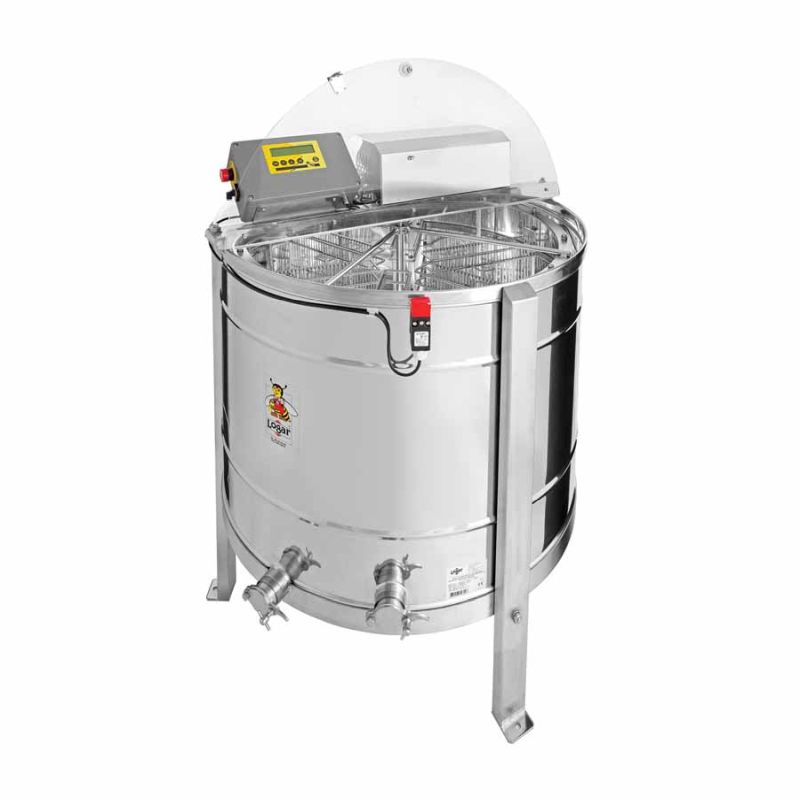 Extracteur autovireur 6 cadres Logar, moteur 250 W / 230 V, commande entièrement automatique et dispositif de sécurité intégré qui coupe automatiquement le moteur à l'ouverture du couvercle. L'extracteur est équipé de deux robinets-pince inox 6/4'' ; l'un est positionné au point le plus bas afin que tout le miel puisse s'écouler. Toutes les pièces en contact avec le miel sont en matériaux compatibles avec les denrées alimentaires. Le couvercle est en acrylique transparent.