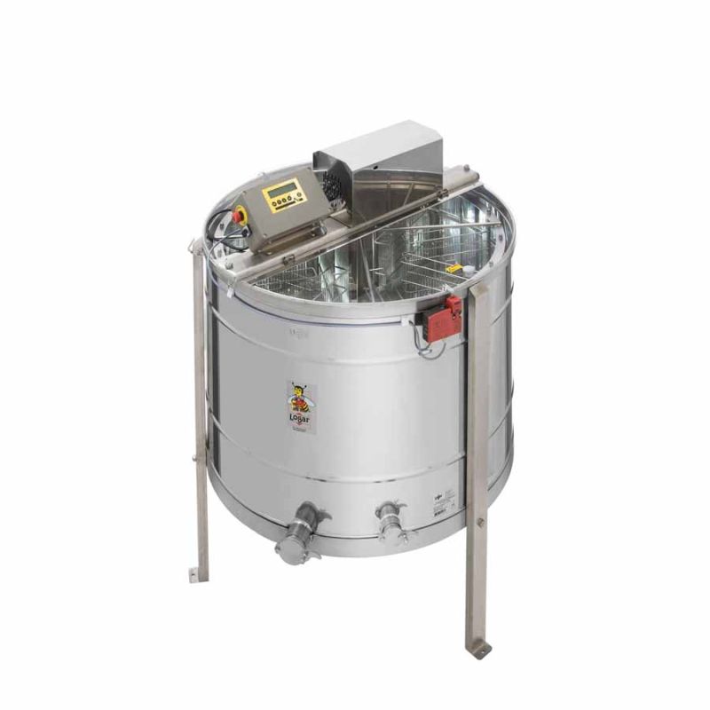 Extracteur autovireur 8 cadres de Logar, équipé d'un entraînement moteur 370 W / 230 V, d'une commande entièrement automatique et d'un dispositif de sécurité intégré qui coupe automatiquement le moteur à l'ouverture du couvercle. La technologie de pointe permet une conception innovante du fond de cuve : soudé sans joint et incliné vers le robinet de vidange. L'extracteur est muni de deux robinets en acier inox (6/4'' et 2'') ; le robinet 2'' est placé au point le plus bas afin que tout le miel puisse s'écouler. Toutes les pièces en contact avec le miel sont en matériaux conformes à l'usage alimentaire. Le couvercle est en acrylique transparent.