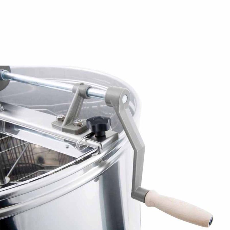 Extracteur tangentiel 4 cadres, à entraînement manuel dans un boîtier métallique avec roue libre et frein de retenue. Les techniques les plus modernes nous ont permis de concevoir de façon innovante le fond de la cuve de l'extracteur. Le fond de la cuve est soudé sans joint et incliné vers la sortie. Le robinet de vidange en inox est soudé au point le plus bas afin que tout le miel puisse s'écouler de l'extracteur. Le nettoyage de l'extracteur est simple. Toutes les pièces en contact avec le miel sont réalisées en matériaux autorisés pour l'alimentaire. Le couvercle est fixé par des charnières spéciales et est en acrylique transparent, permettant d'observer l'opération d'extraction. La construction spéciale des pieds assure une stabilité fiable de l'extracteur.