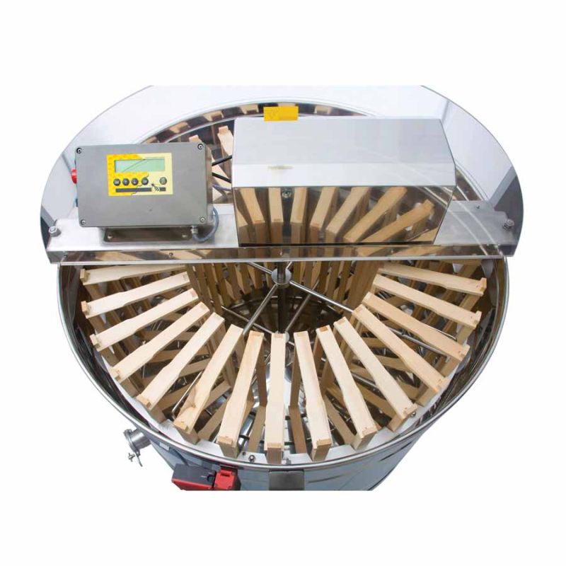 Extracteur radial 32 cadres, entraînement moteur 370 W / 230 V, commande entièrement automatique et dispositif de sécurité intégré qui coupe automatiquement le moteur à l'ouverture du couvercle. La technologie de pointe permet une conception innovante du fond de l'extracteur. Le fond de la cuve est soudé sans joint et incliné vers la sortie. L'extracteur est équipé de deux robinets inox (6/4'' et 2''). Le robinet 2'' est installé au point le plus bas possible afin que tout le miel puisse s'écouler de l'extracteur. Toutes les pièces en contact avec le miel sont en matériaux conformes aux normes alimentaires. Le couvercle est en acrylique transparent.