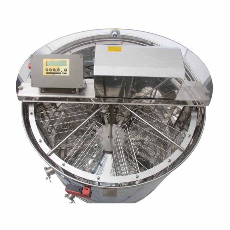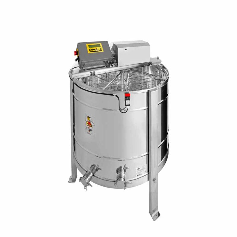 L'extracteur auto‑rotatif 8 cadres de Logar (entièrement électronique) est équipé d'un moteur de 250 W (230 V), d'une commande entièrement automatique et d'un dispositif de sécurité intégré qui coupe automatiquement le moteur à l'ouverture du couvercle. L'extracteur est pourvu de deux robinets à pincement 6/4'' (Ø 42 mm) ; l'un est positionné au point le plus bas afin que tout le miel puisse s'écouler de la cuve. Toutes les pièces en contact avec le miel sont réalisées en matériaux approuvés pour l'alimentation. Le couvercle est en acrylique transparent.